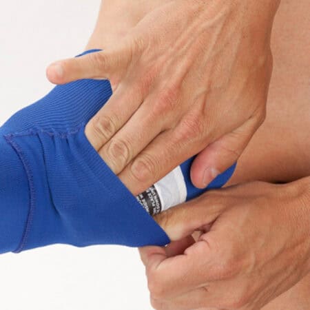 - Schuif de bevroren ice pack in de geïntegreerde zak aan de onderkant en vouw de bovenkant van de sleeve naar beneden over het zakje met de ice pack erin om de compressie te vergroten.